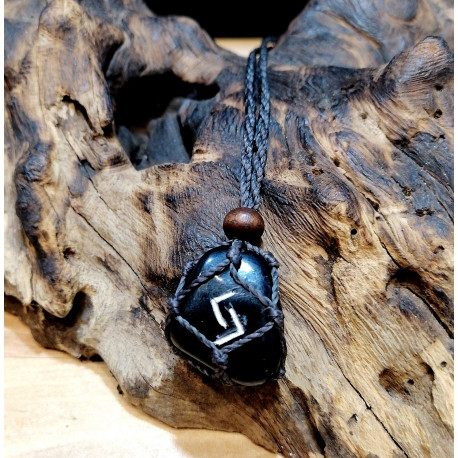 RUNA JERA INCISA A MANO SU PIETRA DI OSSIDIANA, INGABBIATA CON CORDINO IN COTONE CERATO REGOLABILE IN LUNGHEZZA E APRIBILE PER POTER SOSTITUIRE LA PIETRA ALL' INTERNO.
